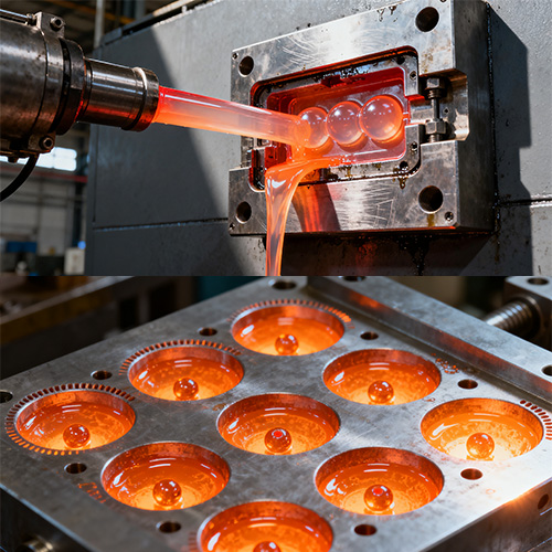 पिघले हुए प्लास्टिक को पेंच के उच्च दबाव से धकेला जाता है और नोजल के माध्यम से प्लास्टिक मोतियों के लिए विशेष मोल्ड की गुहा में जल्दी से इंजेक्ट किया जाता है;