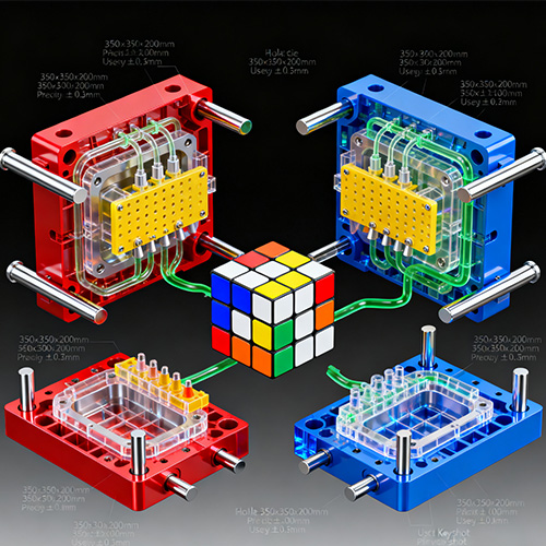 प्लास्टिक रूबिक क्यूब इंजेक्शन मोल्डिंग एक ऐसी तकनीक को संदर्भित करती है जो अनुकूलित इंजेक्शन मोल्डिंग प्रक्रियाओं के माध्यम से रूबिक क्यूब्स (जैसे क्यूब ब्लॉक, केंद्रीय शाफ्ट आस्तीन, स्प्रिंग्स, पोजिशनिंग बकल) के मुख्य घटकों का उत्पादन करती है, और अंत में उन्हें प्लास्टिक रूबिक क्यूब्स में इकट्ठा करती है जो लचीले ढंग से घूम सकती हैं और एक बहाली कार्य कर सकती हैं। इसकी मुख्य विशेषता उच्च परिशुद्धता मोल्डिंग (±0.02 मिमी के भीतर आयामी सहिष्णुता) और रूबिक के क्यूब घटकों की संरचनात्मक अनुकूलनशीलता का एहसास करने के लिए इंजेक्शन मोल्डिंग प्रक्रिया का उपयोग करना है, जो आसन्न क्यूब ब्लॉकों (रोटेशन प्रतिरोध 50-100 ग्राम) और सटीक स्थिति (मिसलिग्न्मेंट विचलन ≤0.1 मिमी) के सुचारू रोटेशन को सुनिश्चित करता है। पारंपरिक मैनुअल प्रोसेसिंग या 3डी प्रिंटिंग की तुलना में, प्लास्टिक रूबिक क्यूब इंजेक्शन मोल्डिंग लागत नियंत्रण और उत्पाद स्थिरता को संतुलित करते हुए बड़े पैमाने पर मानकीकृत उत्पादन का एहसास कर सकता है। इसका व्यापक रूप से खिलौनों, शिक्षा, प्रतिस्पर्धी खेलों और अन्य क्षेत्रों में उपयोग किया जाता है, जो प्रवेश स्तर से लेकर पेशेवर गति-समाधान स्तरों तक विभिन्न रूबिक क्यूब आवश्यकताओं को अपनाता है।