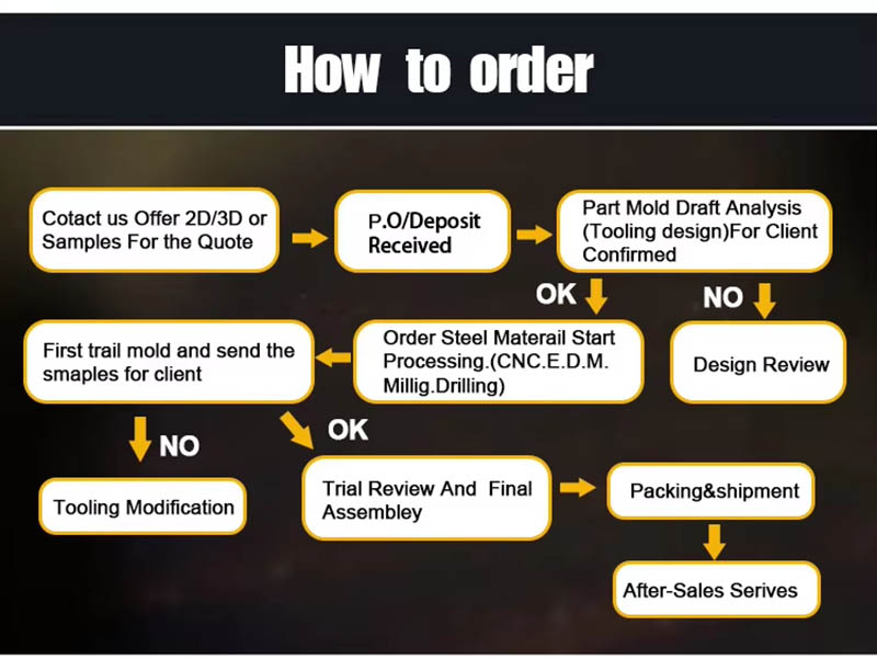 लेखा परीक्षा चित्र - मोल्ड प्रवाह विश्लेषण - डिजाइन सत्यापन - कस्टम सामग्री - मोल्ड प्रसंस्करण - कोर प्रसंस्करण - इलेक्ट्रोड मशीनिंग - धावक प्रणाली प्रसंस्करण - भागों प्रसंस्करण और खरीद - मशीनिंग स्वीकृति - गुहा सतह उपचार प्रक्रिया - जटिल मोड मरो - संपूर्ण मोल्ड सतह कोटिंग - बढ़ते प्लेट - मोल्ड नमूना - नमूना परीक्षण - भेजना नमूने |